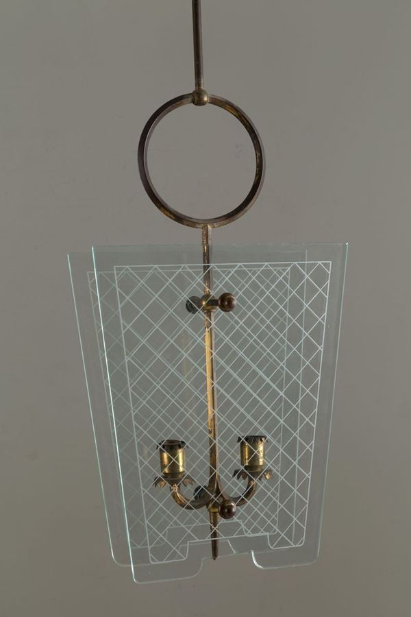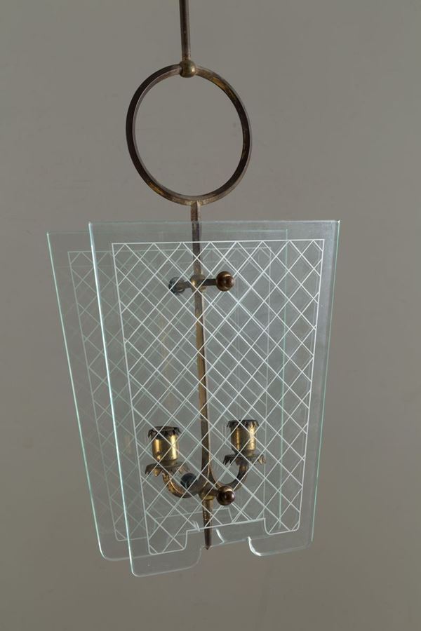 Lampadario in vetro e ottone. Anni '30.