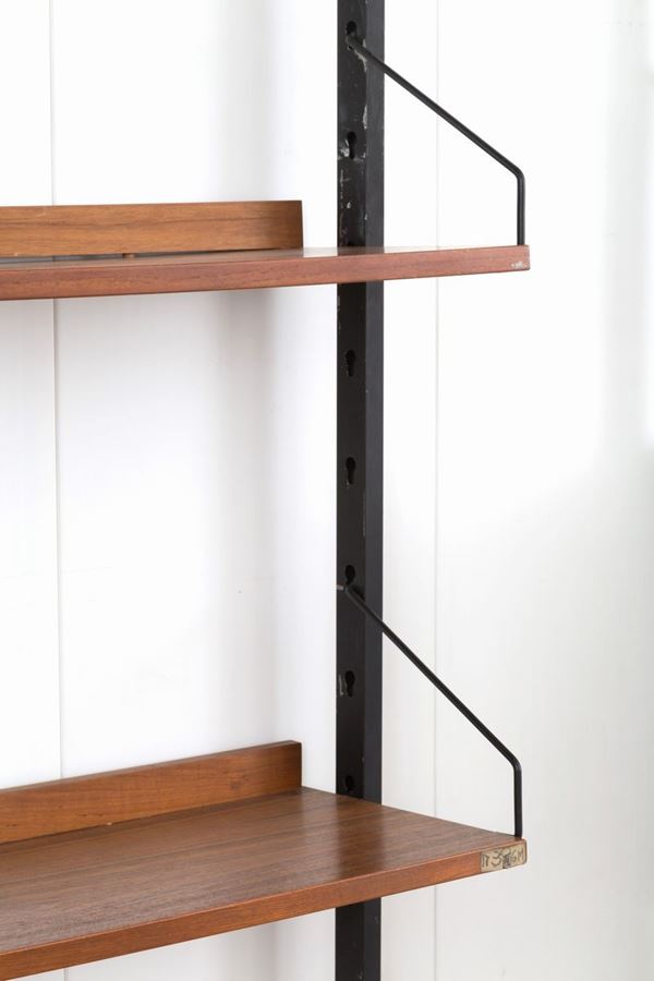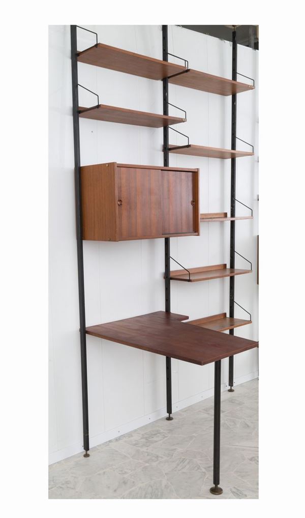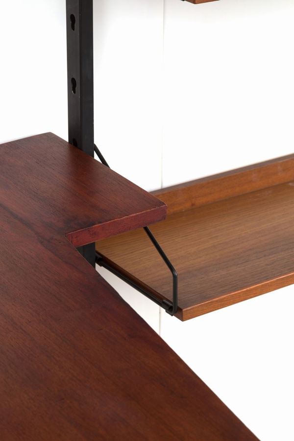 Libreria in ferro color nero con modulo a due ante scorrevoli, sette mensole e una scrivania in legno. Anni '70. Lievi difetti.