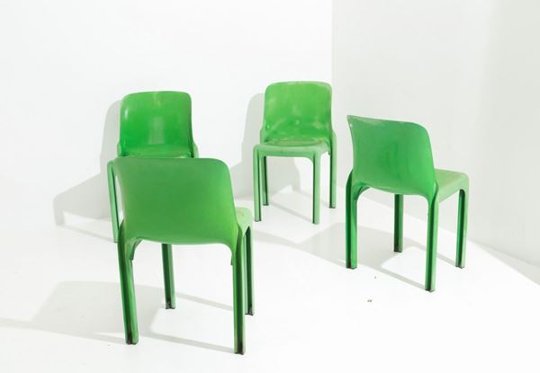 VICO MAGISTRETTI (Milano, 1920-2006). Quattro sedie Selene in materiale plastico verde. Anni '60-'70.
