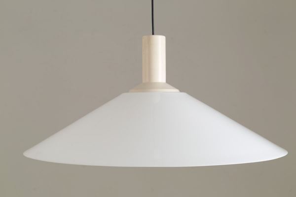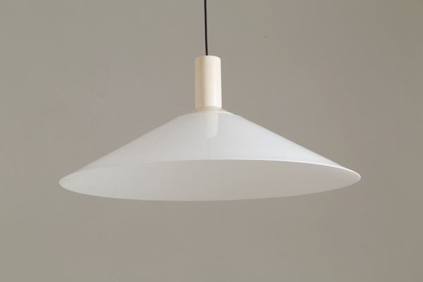 ELIO MARTINELLI (Lucca, 1921-2004) per MARTINELLI LUCE. Grande lampada a sospensione modello 1857 in plexiglass bianco opalino e ferro verniciato beige. Anni '70.