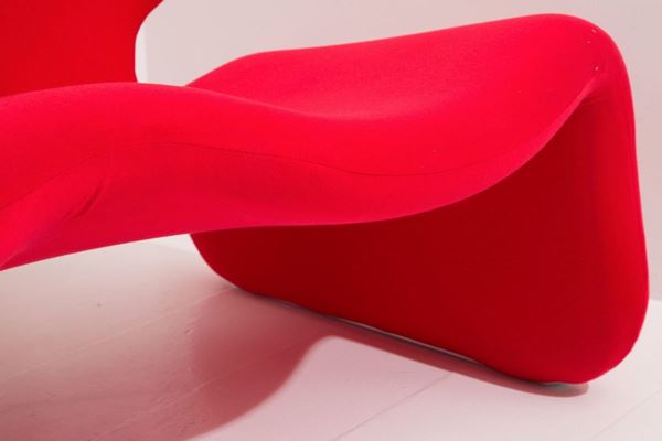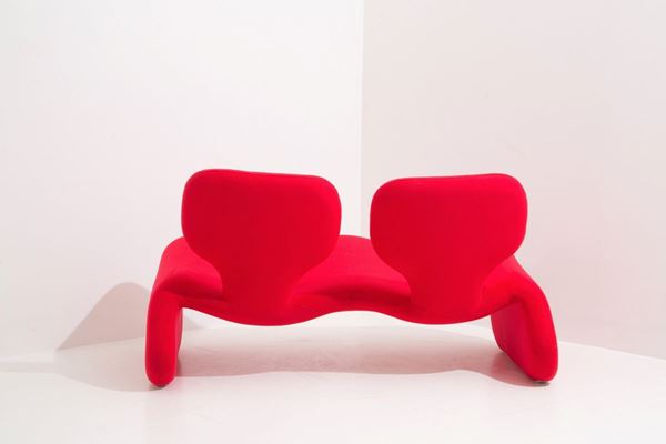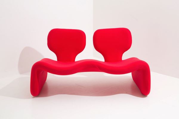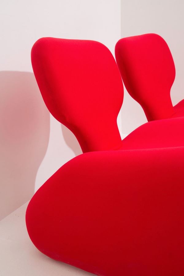 OLIVIER MOURGUE (Parigi, 1939) per ARTIFORT. Divanetto sagomato in tessuto ross...