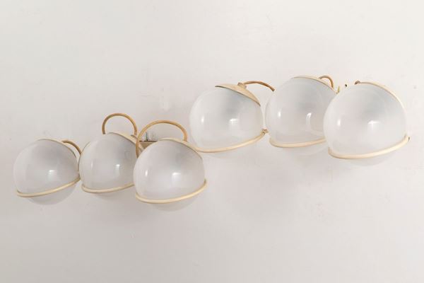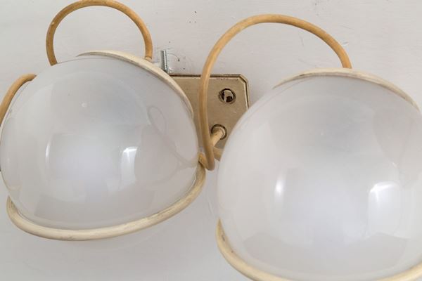 GINO SARFATTI (Venezia, 1912 - Gravedona, 1985) per ARTELUCE. Coppia di lampade da muro tre luci mod. 238/3 in metallo verniciato e vetro. Anni '50-'60. Condizioni originali. Pubblicate in Antonello Mosca (a cura di), Casa Amica, Le Belle Case di Campagna, secondo inserto e in C. Krzentowski e D. Krzentowski, The Complete Designers' Lights, (1950-1990).