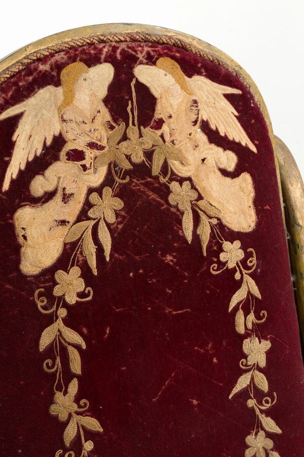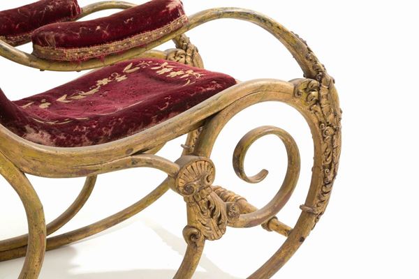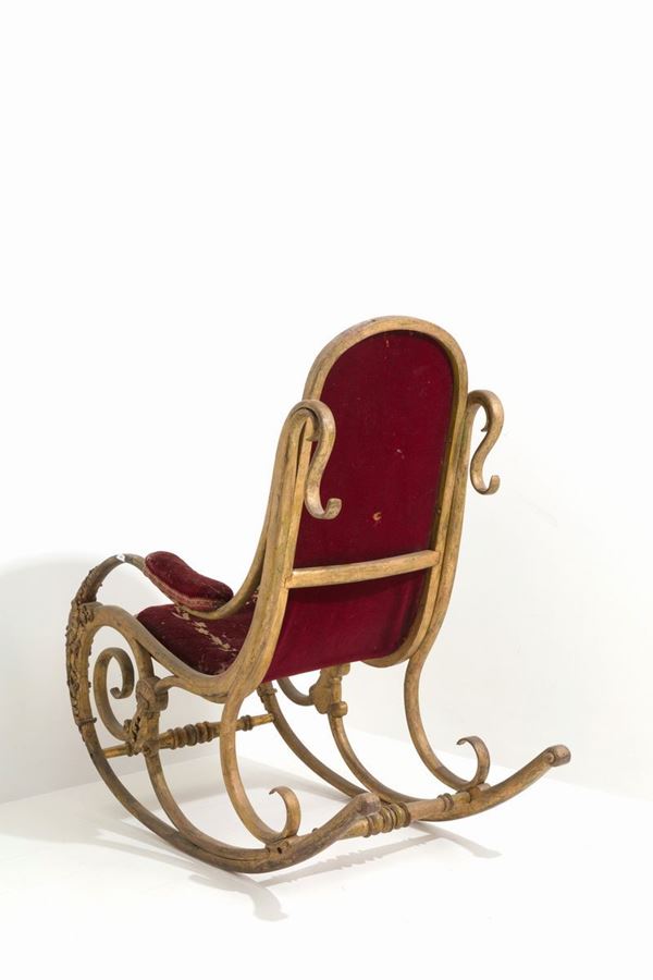 Sedia a dondolo Thonet in legno curvo e velluto. Anni '10-'20. Difetti....