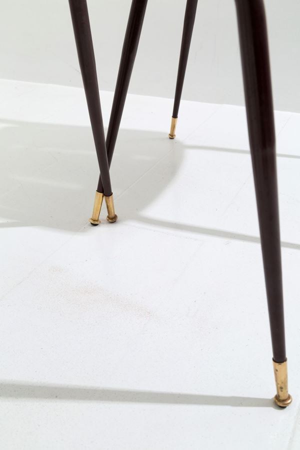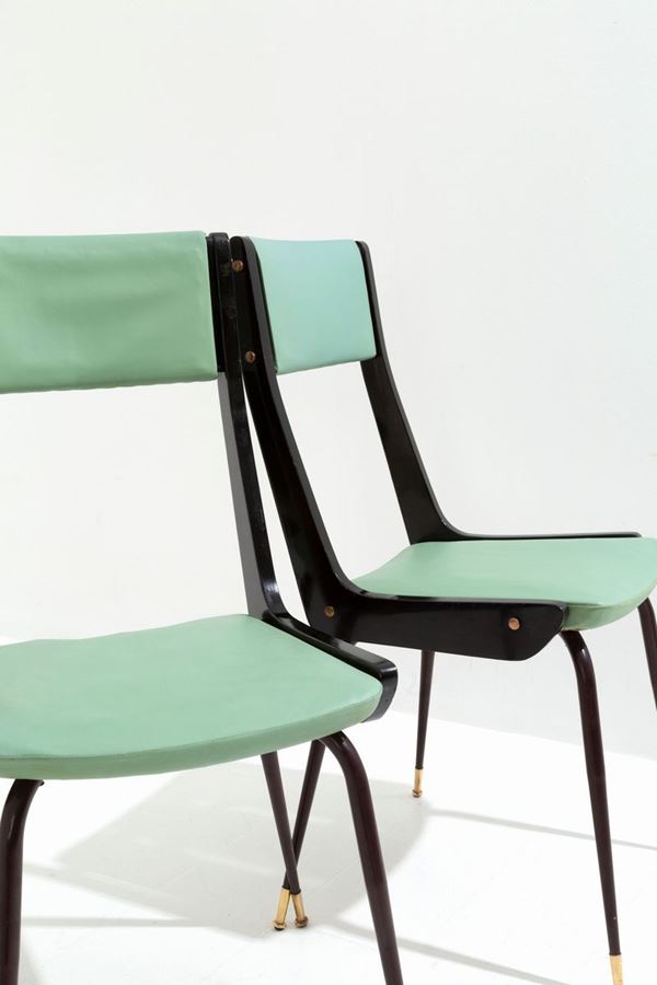 Sei sedie in metallo verniciato, legno e sky verde e puntali in ottone. Manifattura italiana. Anni '50.