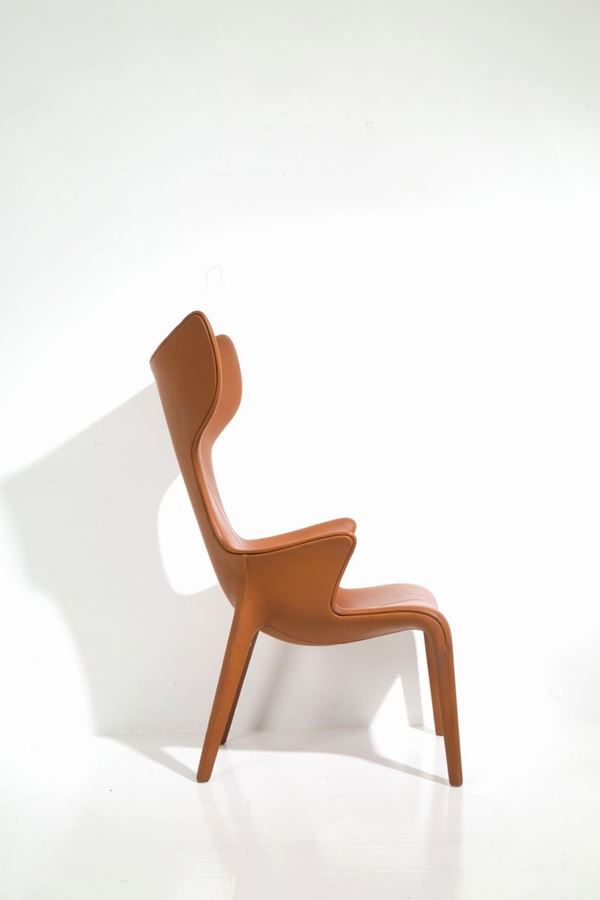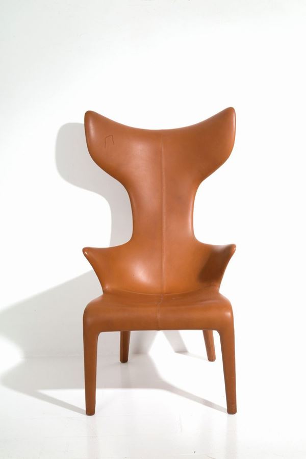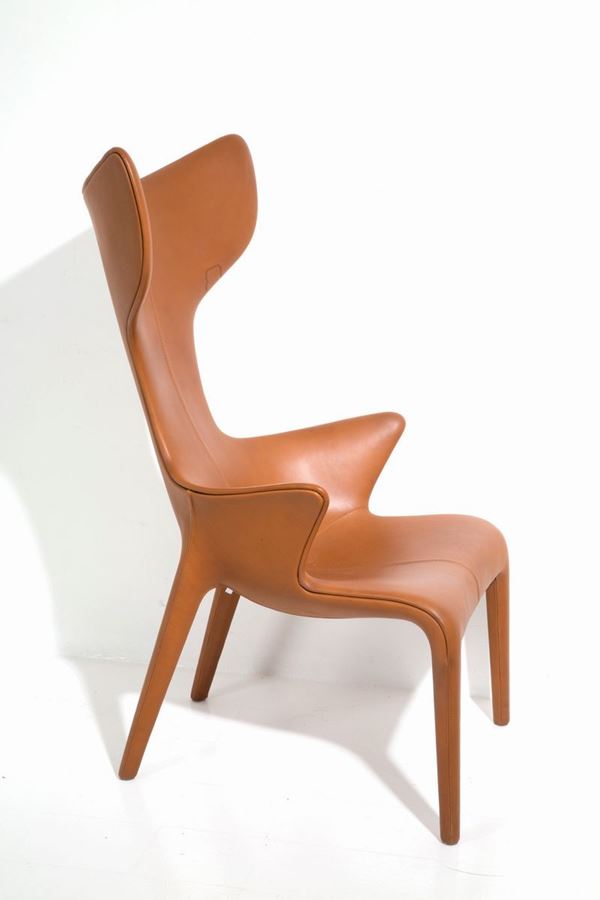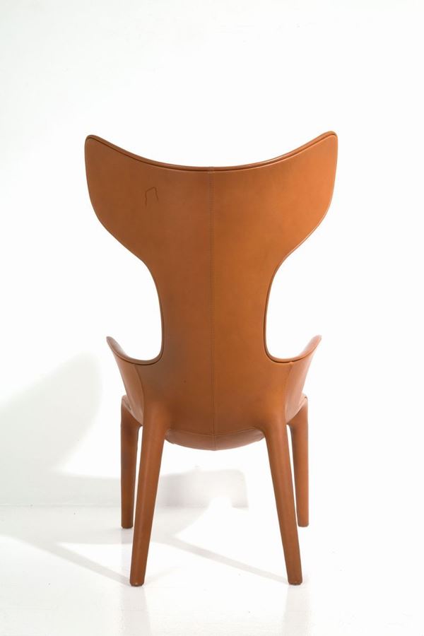 PHILIPPE STARCK (Parigi, 1949) e EUGENI QUITLLET (Ibiza, 1972) per DRIADE. Poltrona Lou Read in fibra di vetro tivestita in pelle marrone. Anni '60. Modello disegnato per l'hotel monceau a Parigi, liberamente ispirato all'incontro tra Philippe Starck e l'artista Lou Reed nell'hotel stesso.