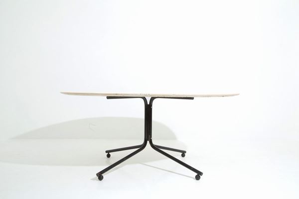 Tavolo in legno laccato bianco con gambe in metallo verniciato. Produzione GAVINA. Anni '60-'70. Difetti.