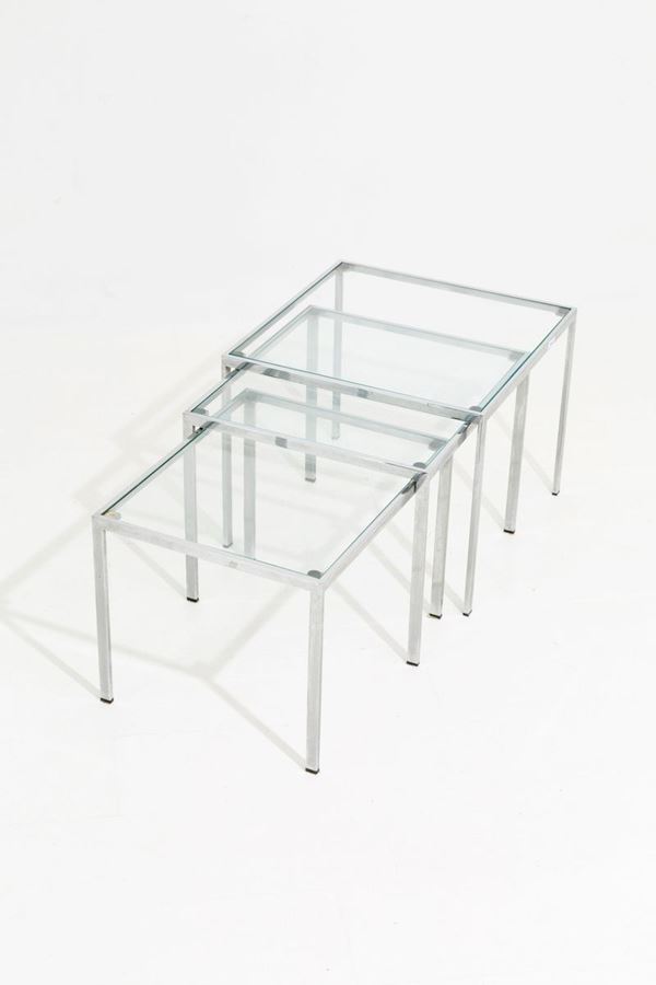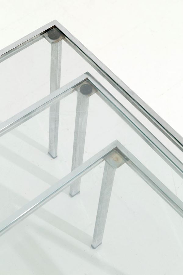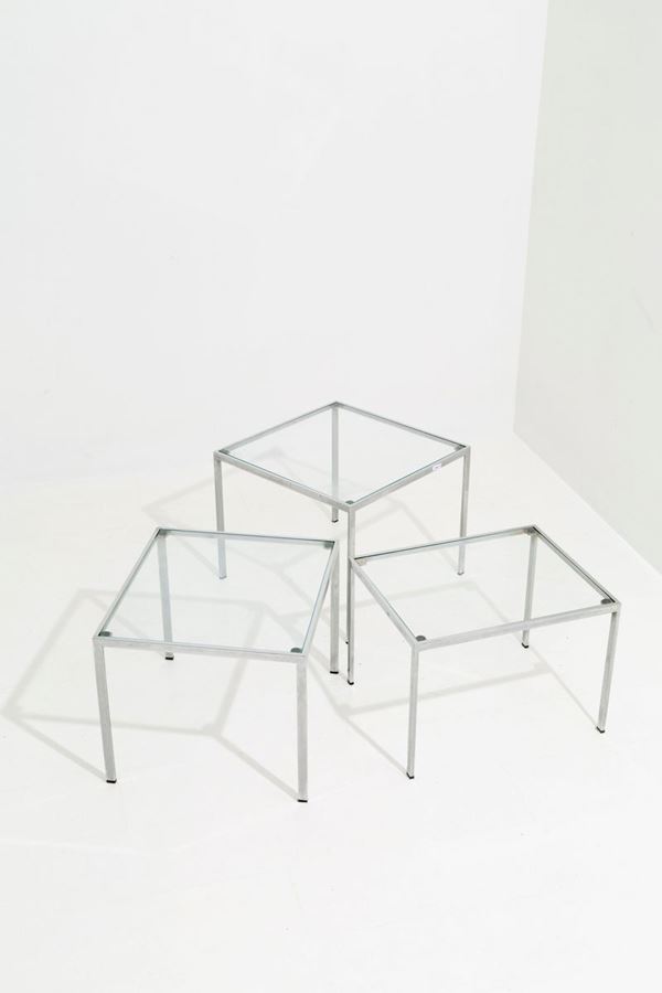 Trittico di tavolini quadrati in metallo cromato con piano in vetro. Manifattur...