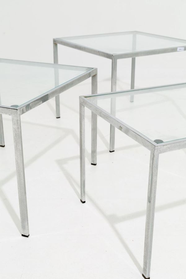 Trittico di tavolini quadrati in metallo cromato con piano in vetro. Manifattura italiana. Anni '70.