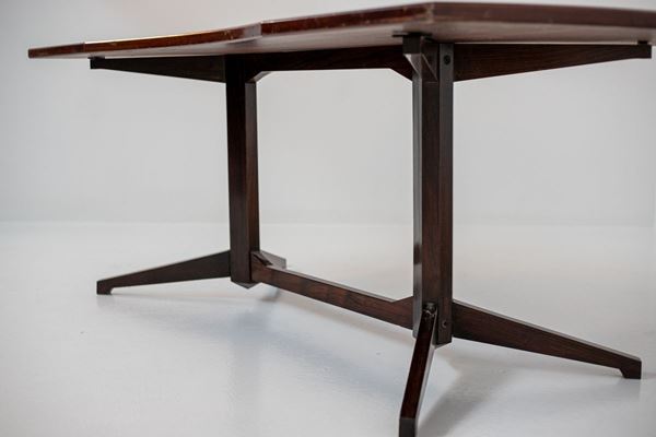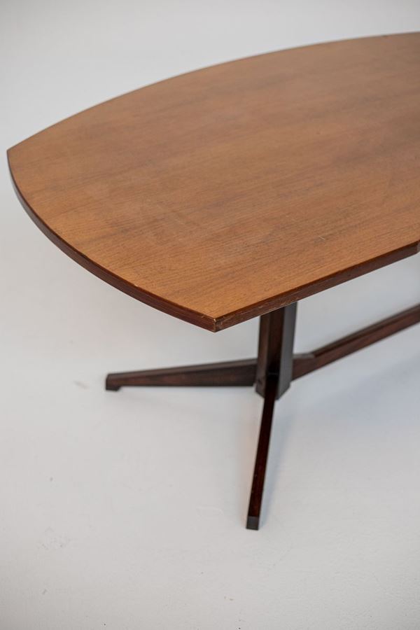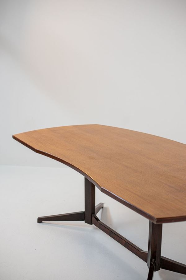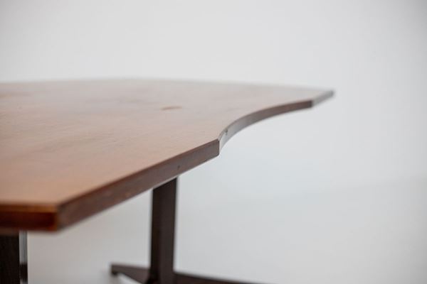 Raro tavolo-scrivania rettangolare in legno con un lato concavo al centro. Produzione POGGI PAVIA. Anni '50. Lievi graffi e segni di usura.