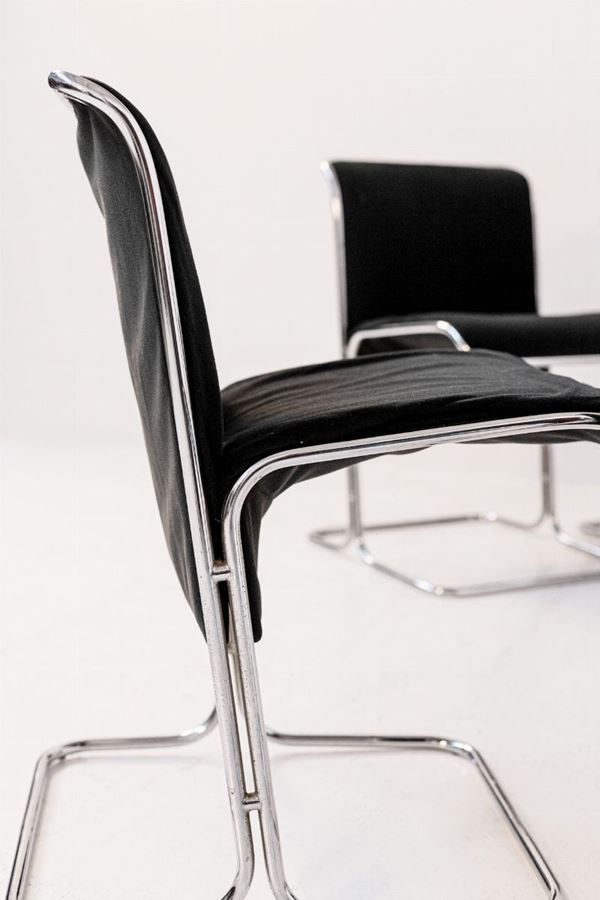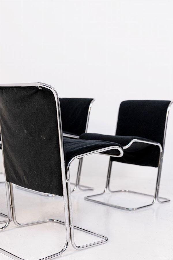 Sedie in tubolare d'acciaio con seduta e schienale in velluto nero originale. Produzione ARTFLEX. Anni '70. Lievi graffi e segni di usura. Altezza della seduta cm. 44 ca.