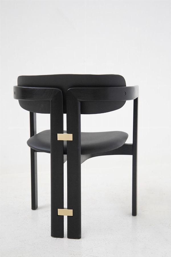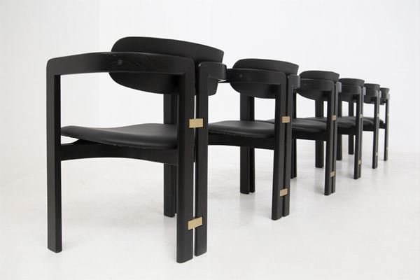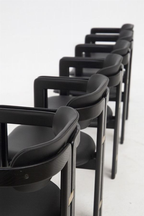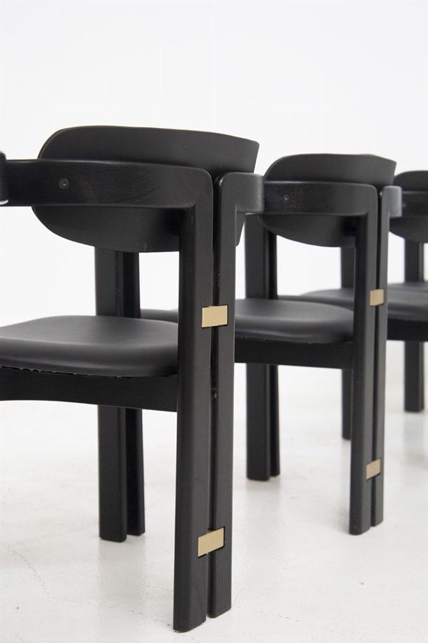Sei sedie da pranzo Pamplona in legno di frassino, pelle nera e alluminio. Produzione POZZI. 1965.Altezza della seduta cm. 41 ca.