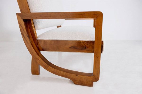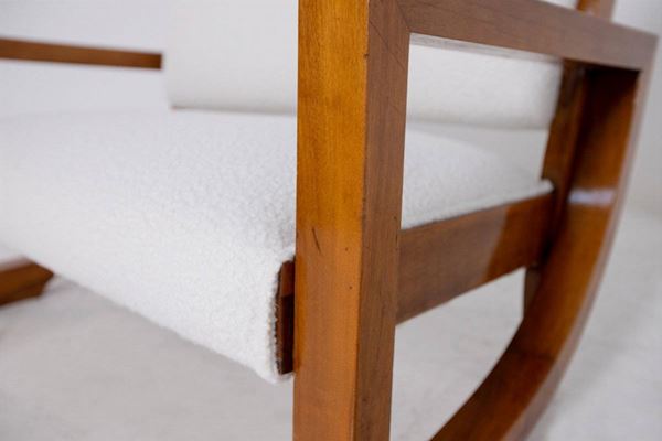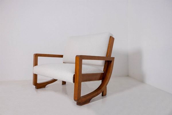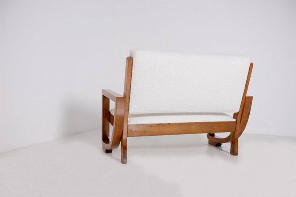 Poltrona Loveseat in legno e tessuto bouclé bianco. Anni '40.