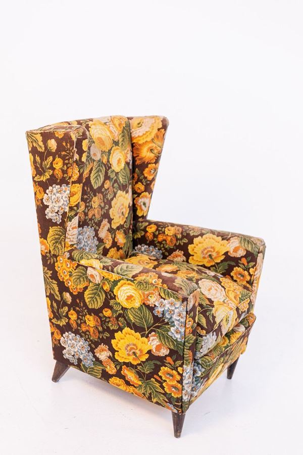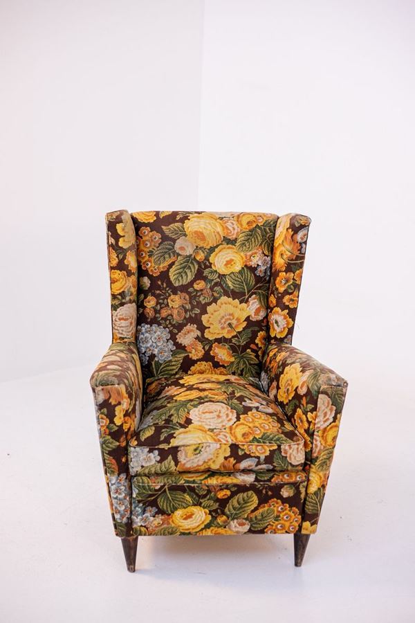 Poltrona in legno con tessuto floreale. Anni '50. Condizioni e tessuto originali.