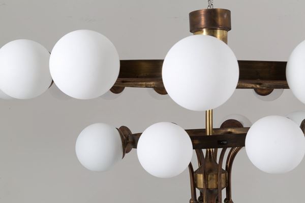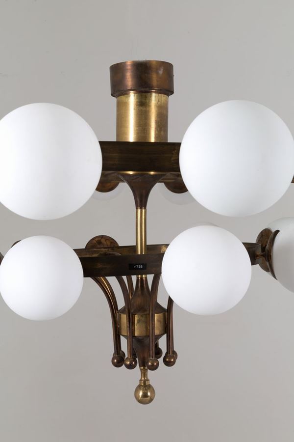 Lampadario ventiquattro luci in ottone e vetro. Con marchio del produttore. Produzione AZUCENA. Anni '50.