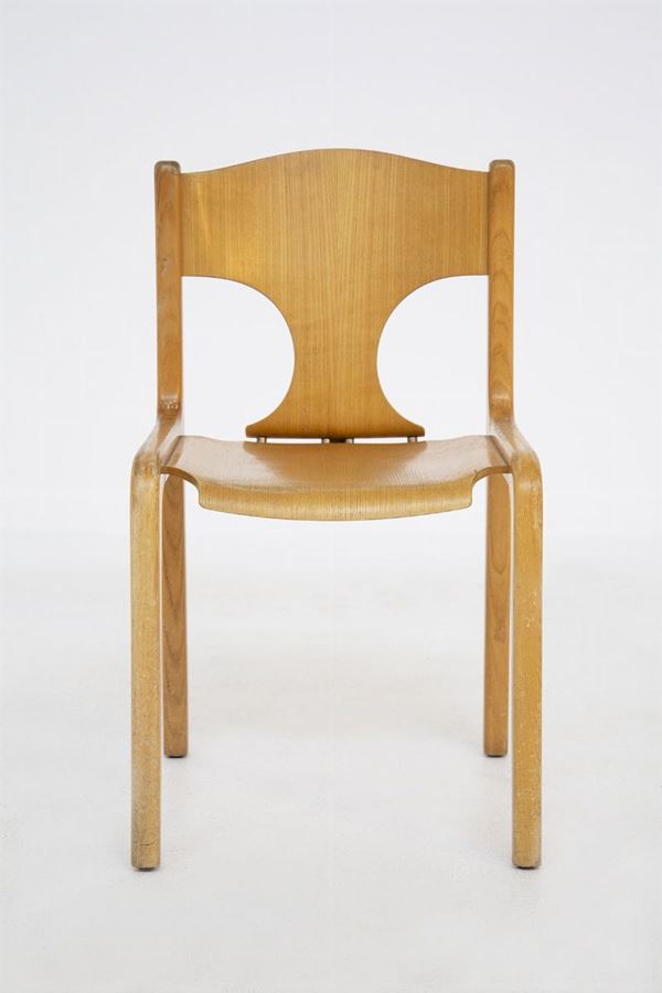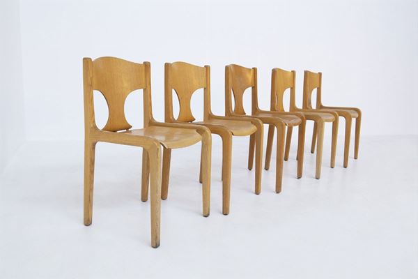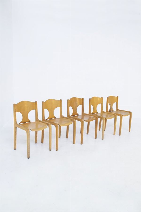 Cinque sedie in legno. Produzione POZZI. Anni '60.