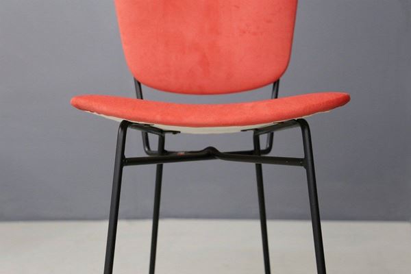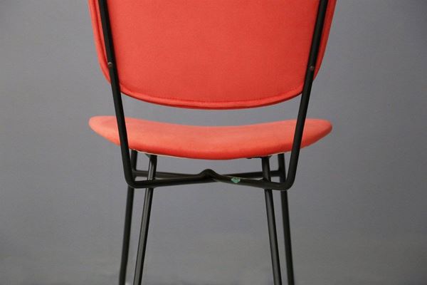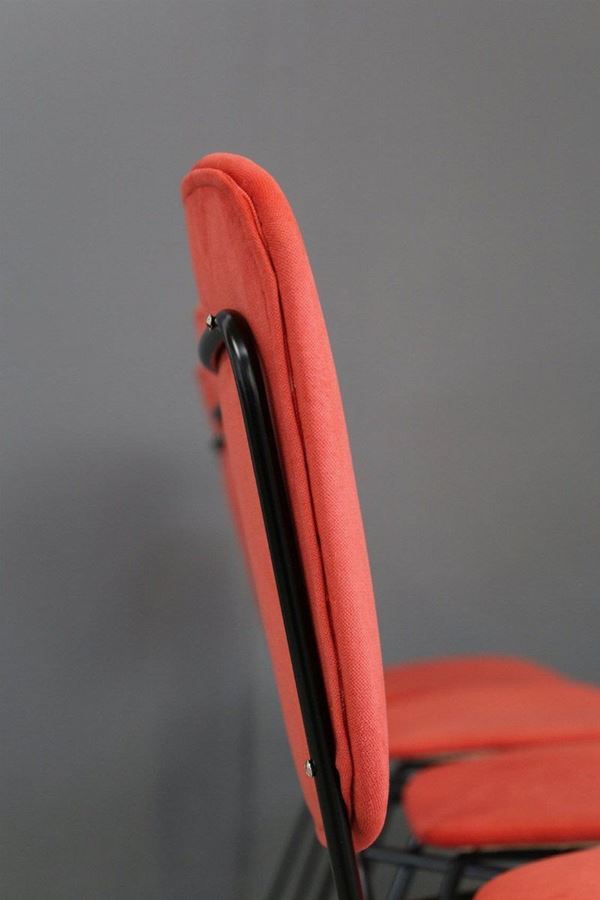 Cinque sedie con gambe in tondino di ferro verniciato nero e seduta e schienale in legno curvato foderato con tessuto rosso. Produzione DORO CUNEO. Etichetta del produttore. Anni '60. Restaurate.