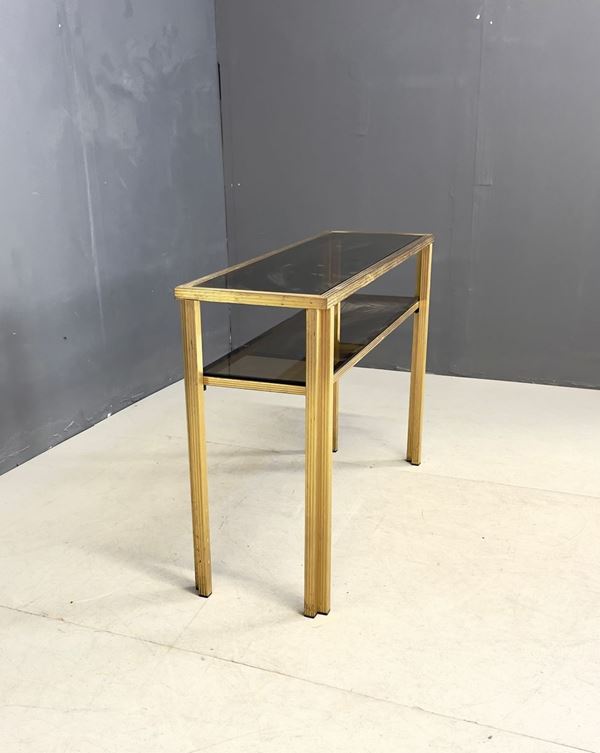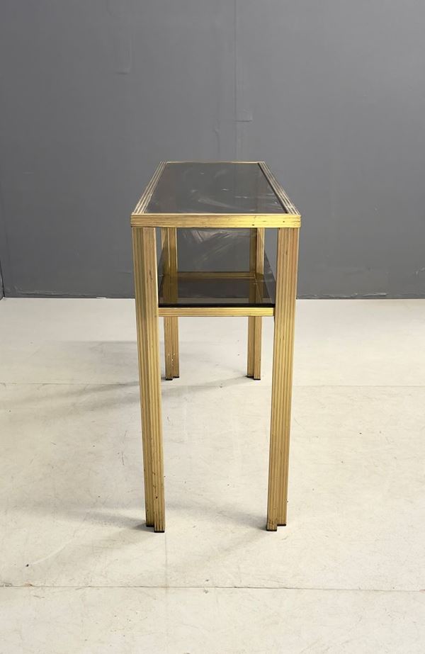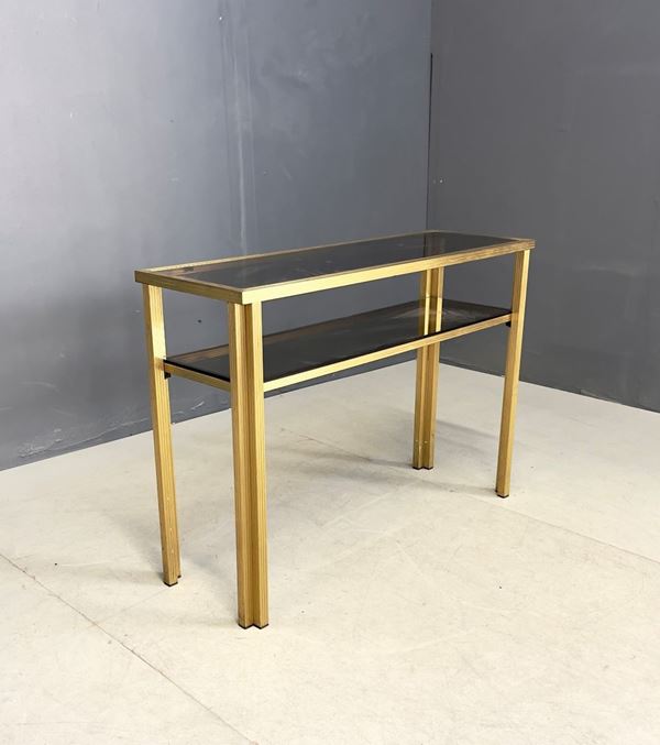 Consolle in ottone con top e ripiano in vetro. Manifattura italiana. Anni '70. Lievi segni di usura.
