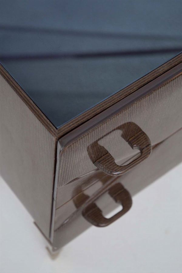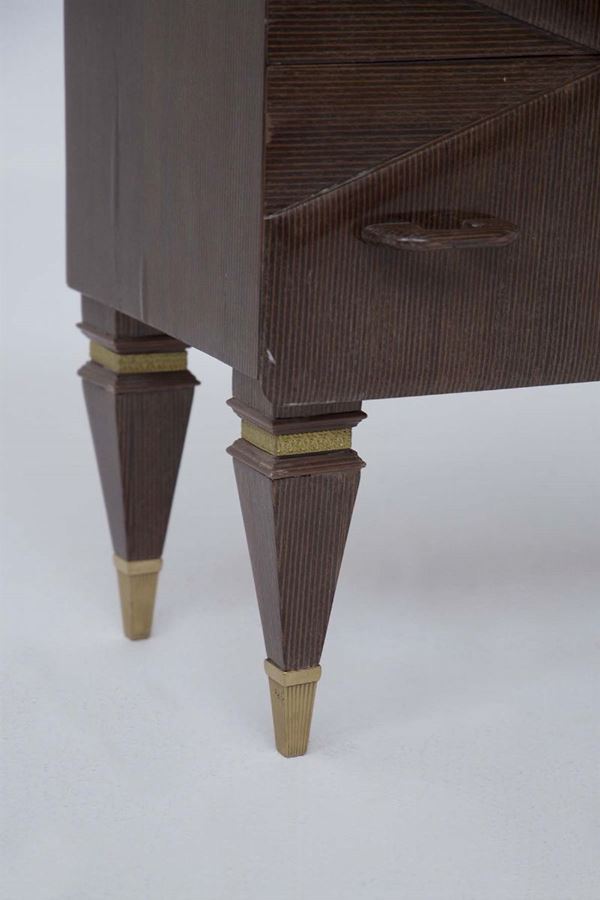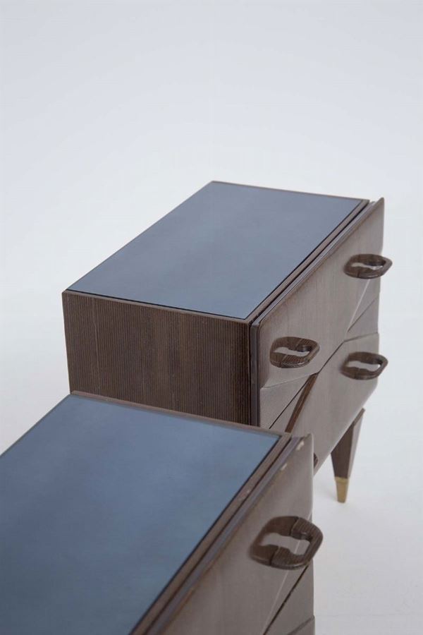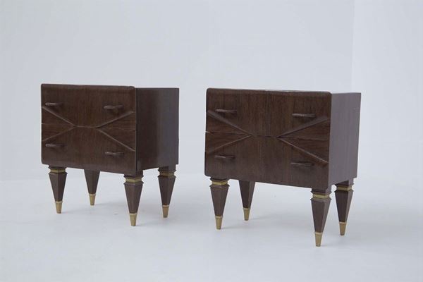 Coppia di comodini in legno, inserti in ottone e piano in vetro satinato. Manifattura italiana. Anni '50. Condizioni originali.
