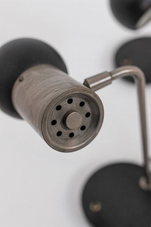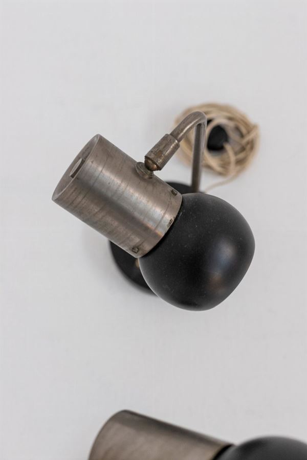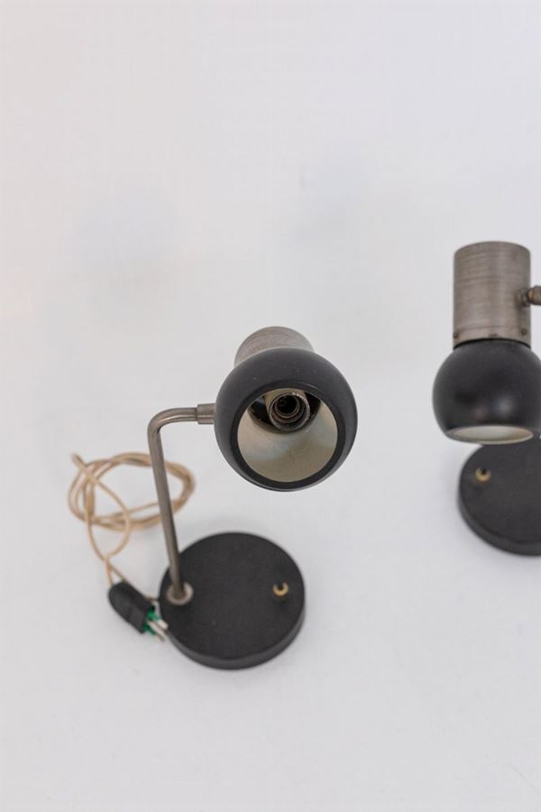 Coppia di lampade da tavolo in ottone nichelato e alluminio verniciato con fascio luminoso regolabile. Base circolare di colore nero. Produzione FAAI ARREDO CREMONA. Con etichetta del produttore sul fondo. Anni '60. Condizioni originali.