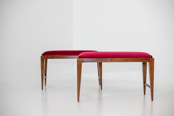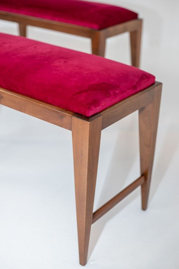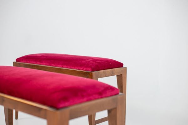Coppia di panchette in legno di noce e velluto rosso. Manifattura italiana. Anni '50. Rifoderate.