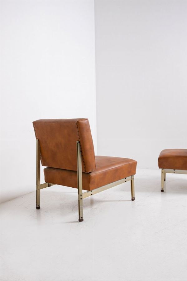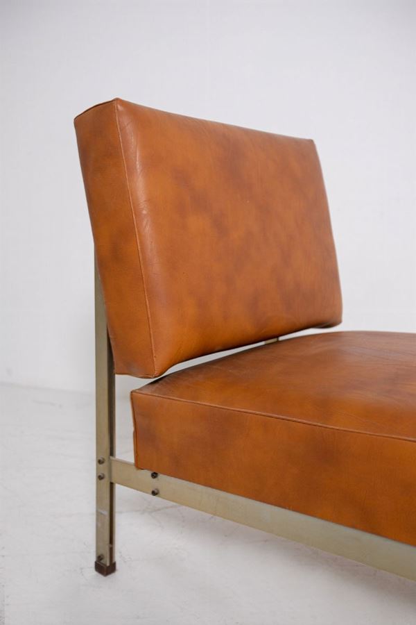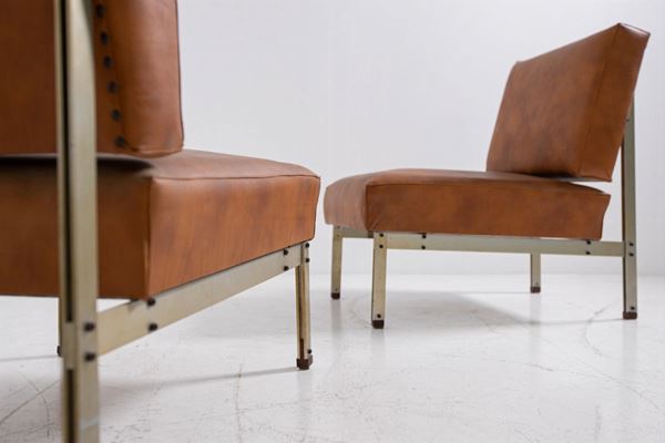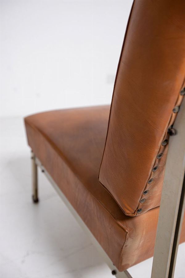 Coppia di poltrone in acciaio e pelle marrone nello stile di Florence Knoll. Anni '50. Altezza della seduta cm 37 ca.