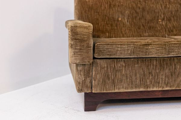 Divano a tre posti in legno e velluto. Produzione SAPORITI ITALIA. Anni '60. Condizioni originali.Altezza della seduta cm. 41 ca.