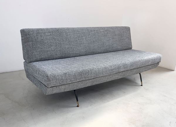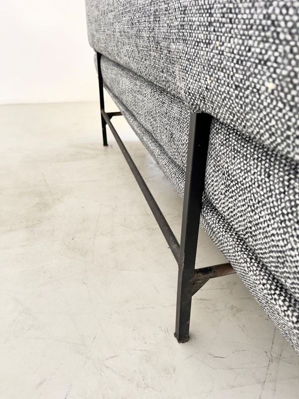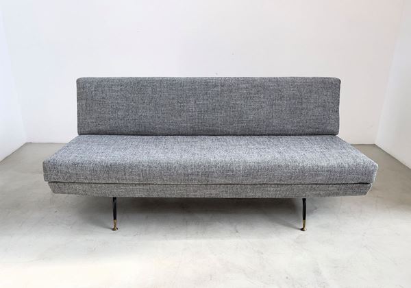 Divano letto tre posti in metallo verniciato, ottone e tessuto imbottito. Manifattura italiana. Anni '50. Rifoderato. Altezza della seduta cm. 45 ca.