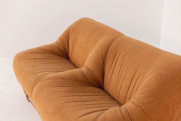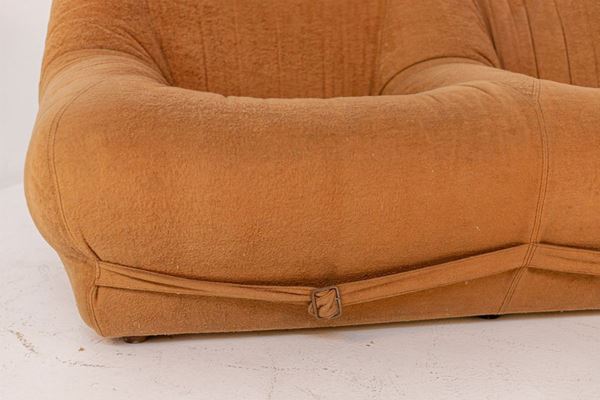 Divano Space Age a due posti con linee arrotondate in velluto ocra con cintura nella parte inferiore ad ornamento. Manifattura italiana. Anni '70.Altezza della seduta cm. 42 ca.