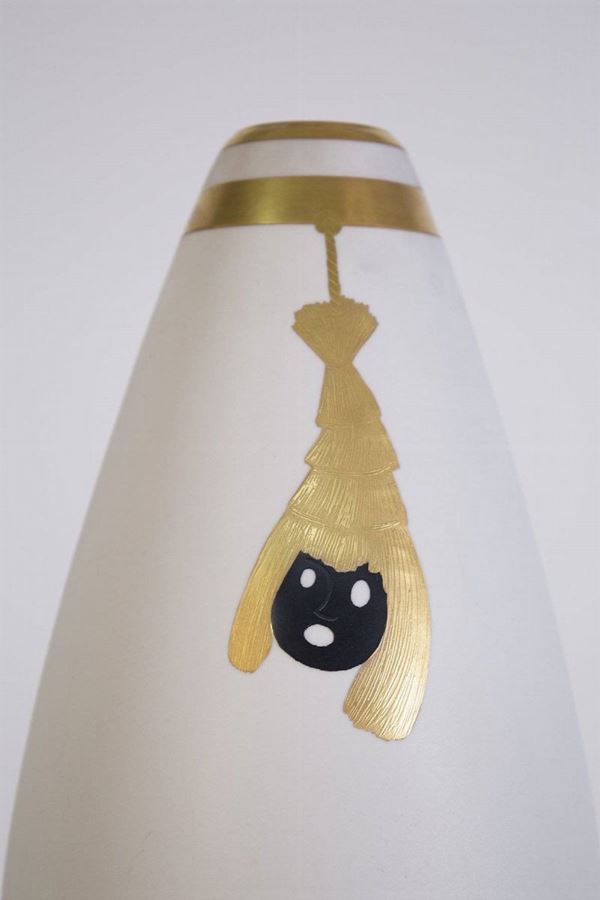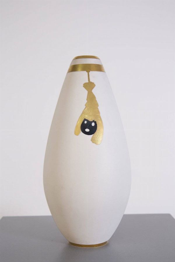 Vaso in porcellana con decori raffiguranti maschere in oro zecchino. Etichetta della manifattura sul fondo. Anni '50.