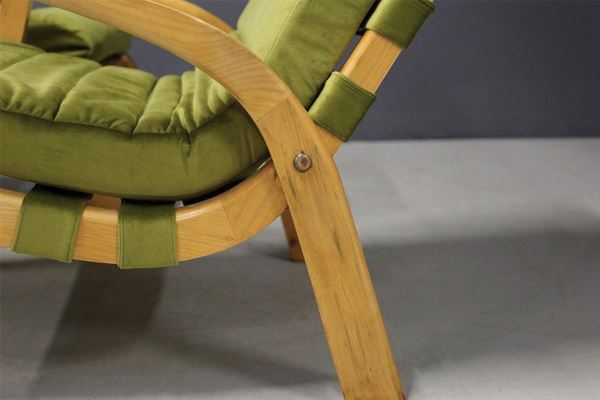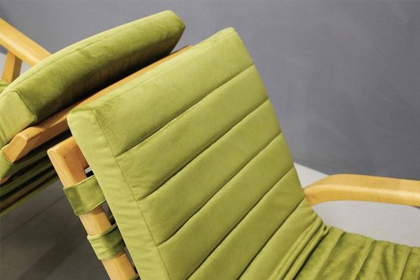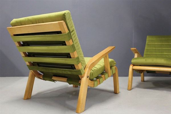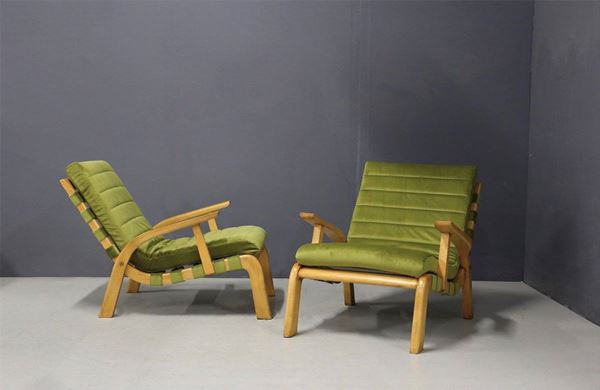 Coppia di poltrone in legno di ciliegio a forma di onda e velluto verde. 1935. Restaurate.