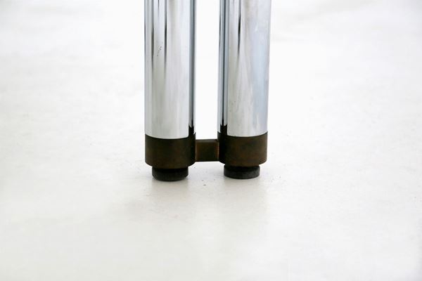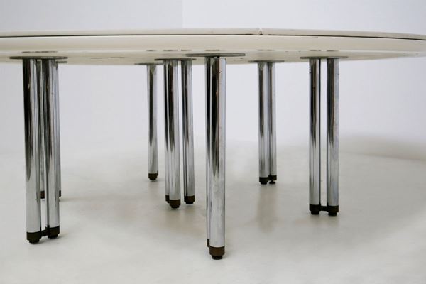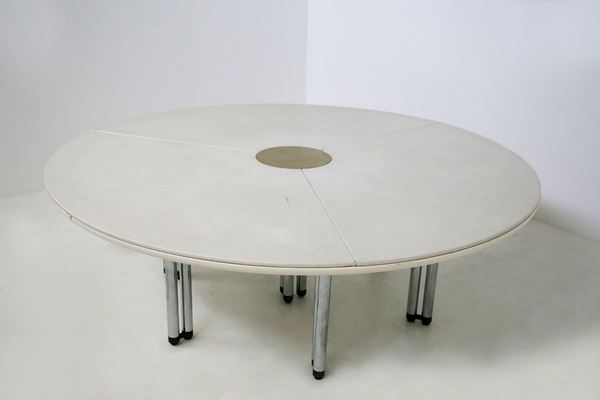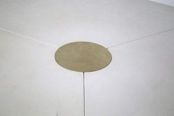 HIROYUKI TOYODA per SIMON-ULTRAMOBILE, San Lazzaro di Savena. Grande tavolo da riunione Byzantium in legno, acciaio e piedini in ottone. Piano circolare diviso in tre spicchi rivestiti in pelle bianca con un tondo centrale rivestito in foglia argento. Disegno del 1980, esemplare del 1984. Pubblicato in D. Gavina, Ultrarazionale Ultramobile, a cura di R. Orsini, Ed. Compositori, Bologna 1998, pp. 214-215.