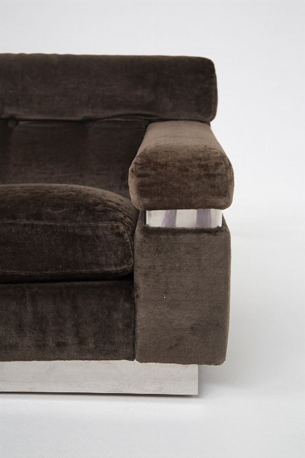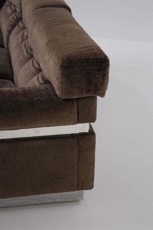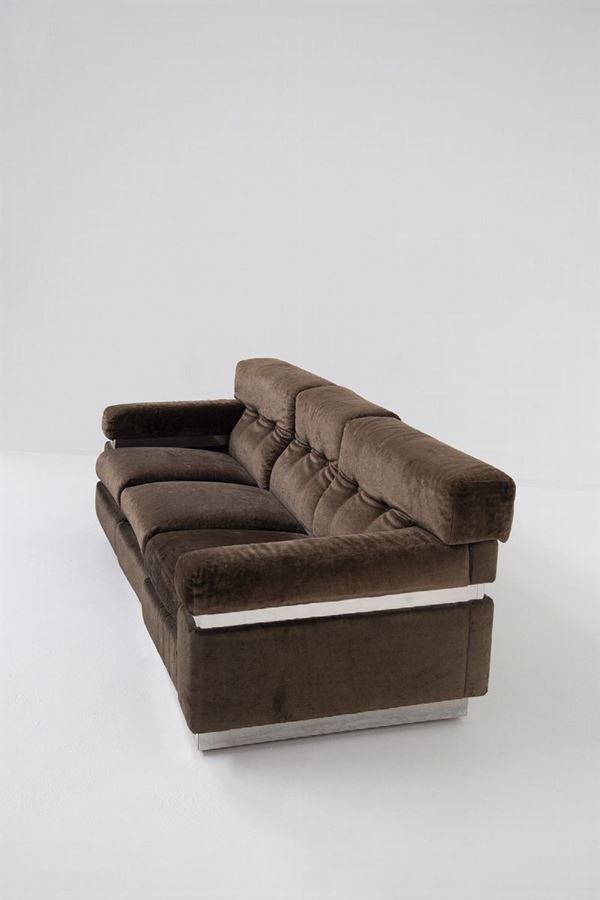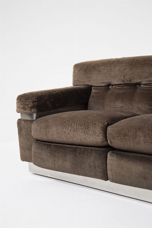 Divano a tre posti in velluto marrone con inserti in ferro cromato. Anni '70.