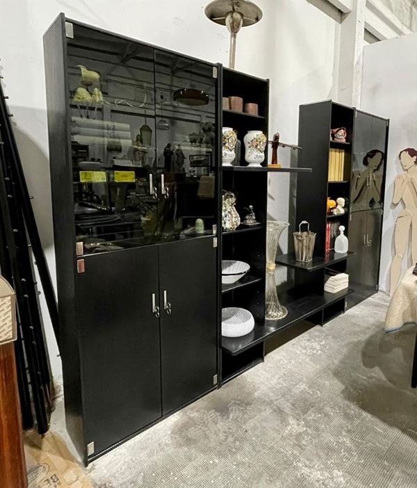 Libreria componibile Pellican in legno e vetro. Composta da due elementi vetrina, due elementi libreria e tre ripiani di collegamento. Sistema di scaffalature con struttura in legno lamellare, elementi in vetro e dettagli in ottone nichelato. Produzione SAPORITI. Anni '70.Mis. vetrina: Lung. cm. 88 Alt. cm. 216 Prof. cm. 37 ca.Mis. libreria: Lung cm. 46 Alt. cm. 216 Prof. cm. 37 ca.