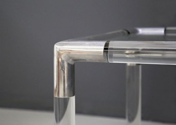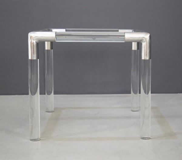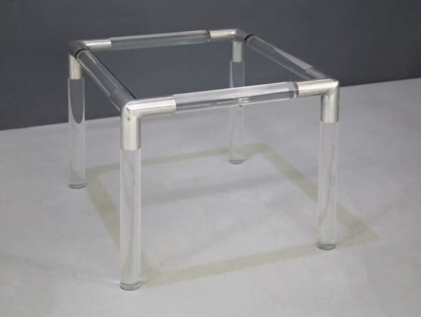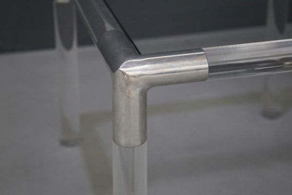 Tavolino T14 in plexiglass tubolare, acciaio grigio metallizzato e piano in vetro. Produzione BIEFFEPLAST. Anni '70.