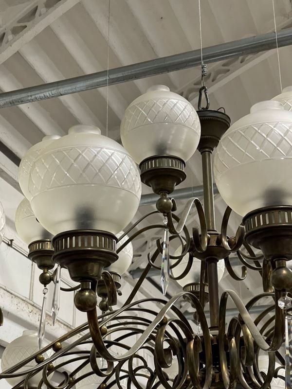Lampadario ventisette luci con bracci in metallo e diffusori di vetro. Era collocato presso la hall dell'Hotel London di Milano. Produzione ARREDOLUCE. Anni '50.