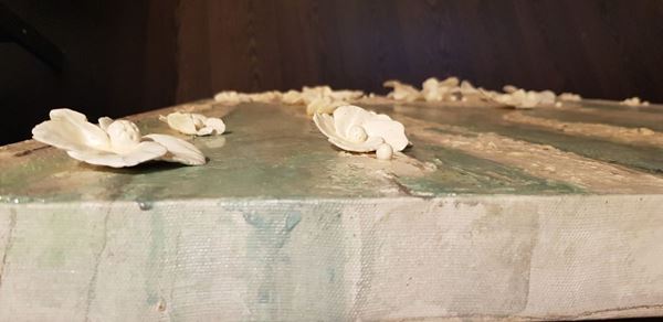 Tecnica mista su tela con resine a rilievo raff. ''FIORI''. Firmata sul retro.