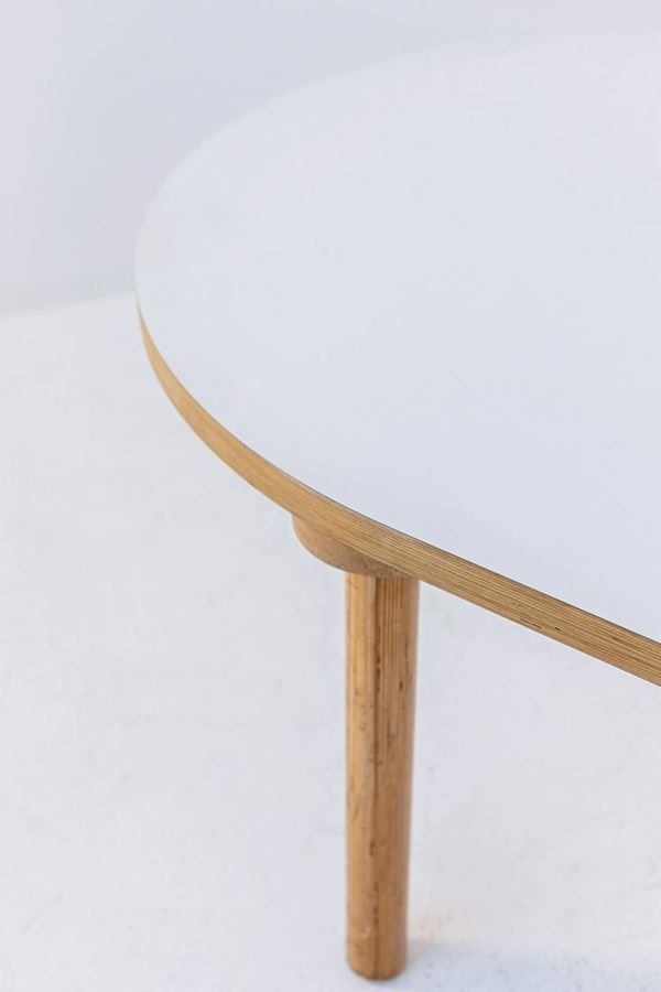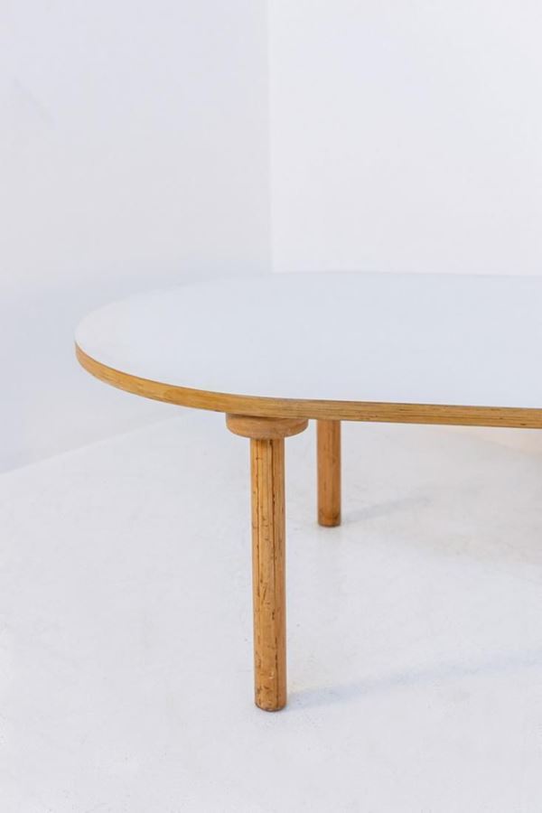 Tavolo in multistrato con piano in laminato bianco. Produzione DRIADE. Anni '70. Pubblicato in  A. d'Avossa, F. Picchi, Enzo Mari. Il lavoro al centro, Electa, Milano, 1999, p. 109. Lievi graffi.