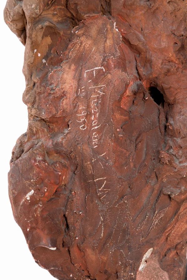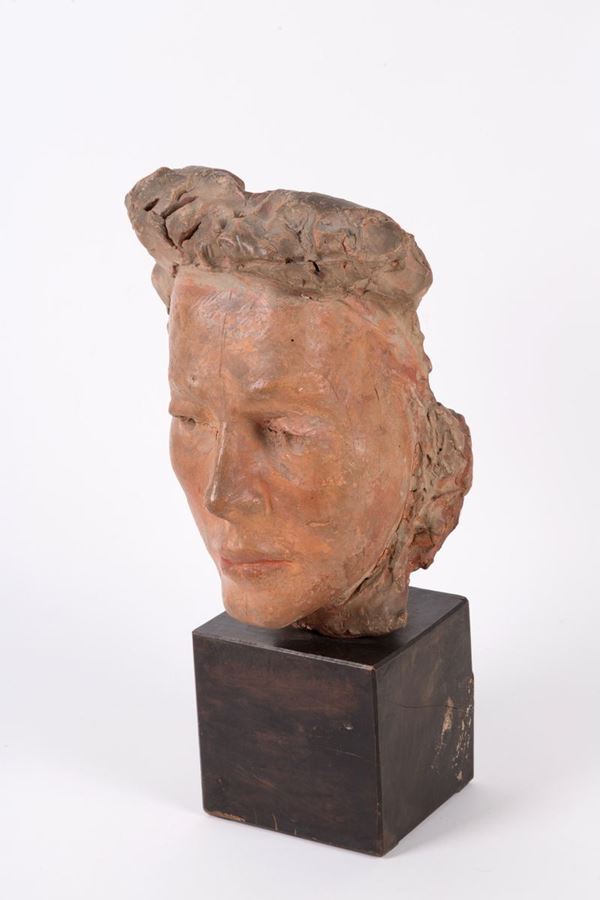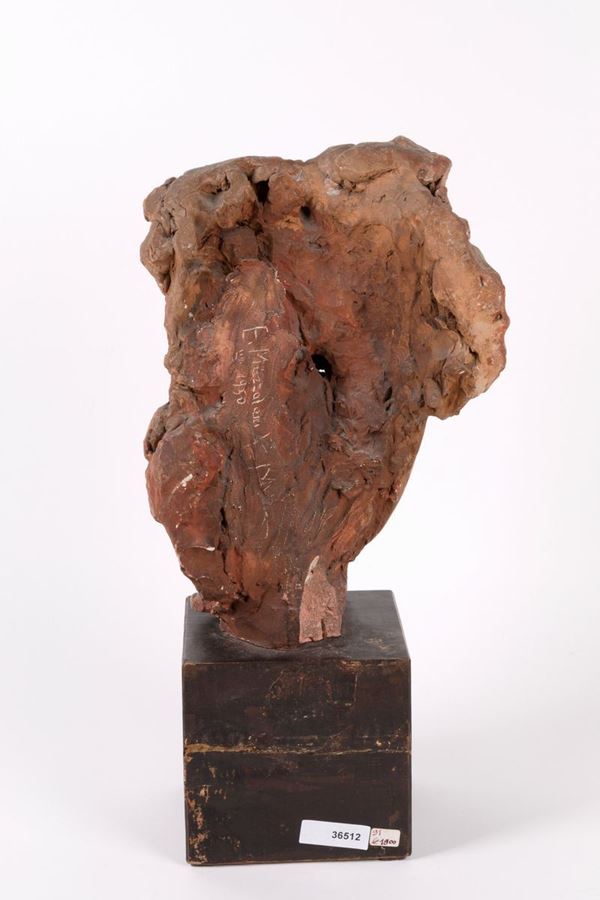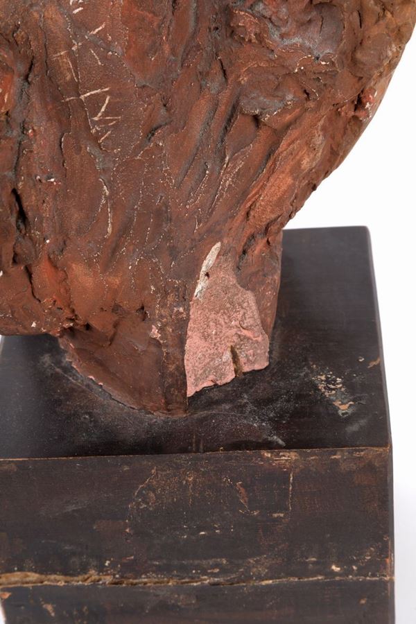 Scultura raff. ''TESTA'' in terracotta su base di legno dipinta. Firmata E. MAZZOLANI sul retro. 1950. Difetto.