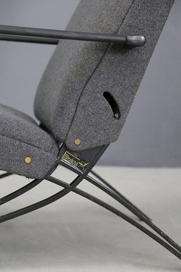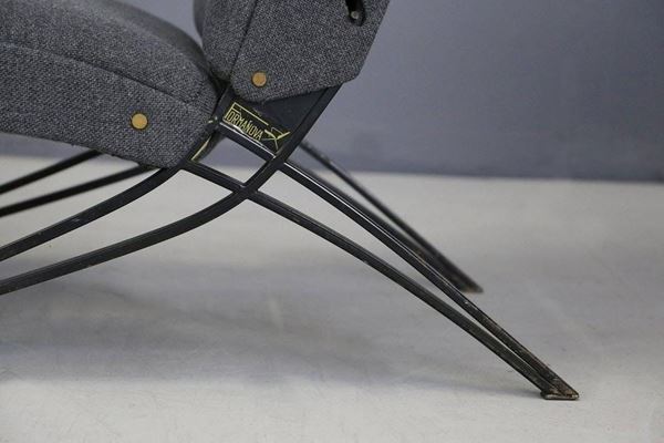 Poltrona reclinabile in tessuto grigio e struttura in metallo. Con etichetta del produttore. Produzione FORMANOVA Anni '60.