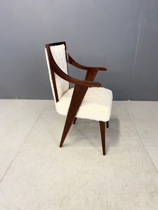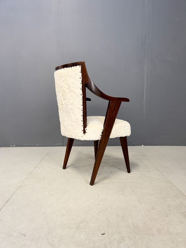 Poltrona in legno, pelliccia ecologica su seduta e schienale e borchie metalliche. Manifattura italiana. Anni '50. Restaurata.Altezza della seduta cm. 49 ca.