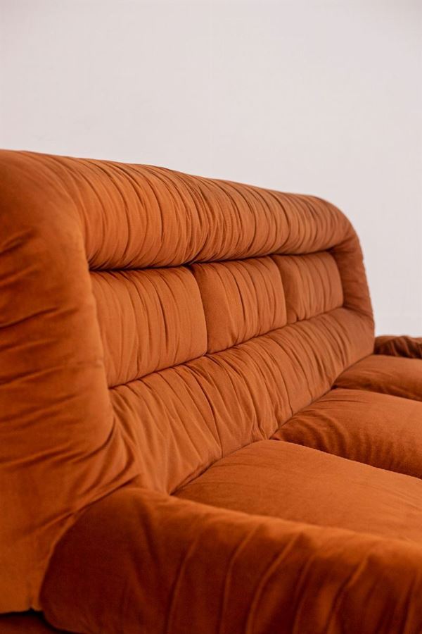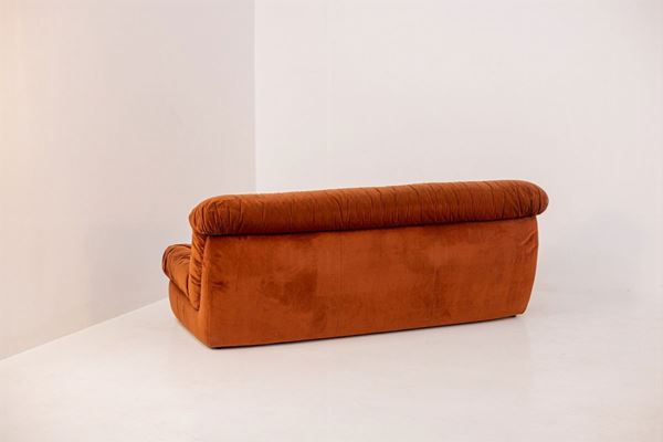 Raro divano Space Age a tre posti in legno rivestito in velluto color terracotta. Manifattura italiana. Anni '70. Condizioni originali.
