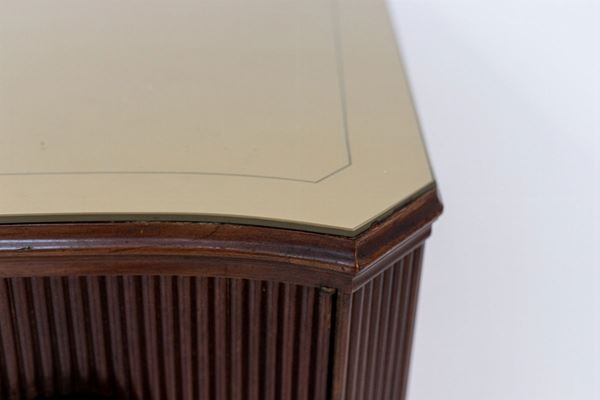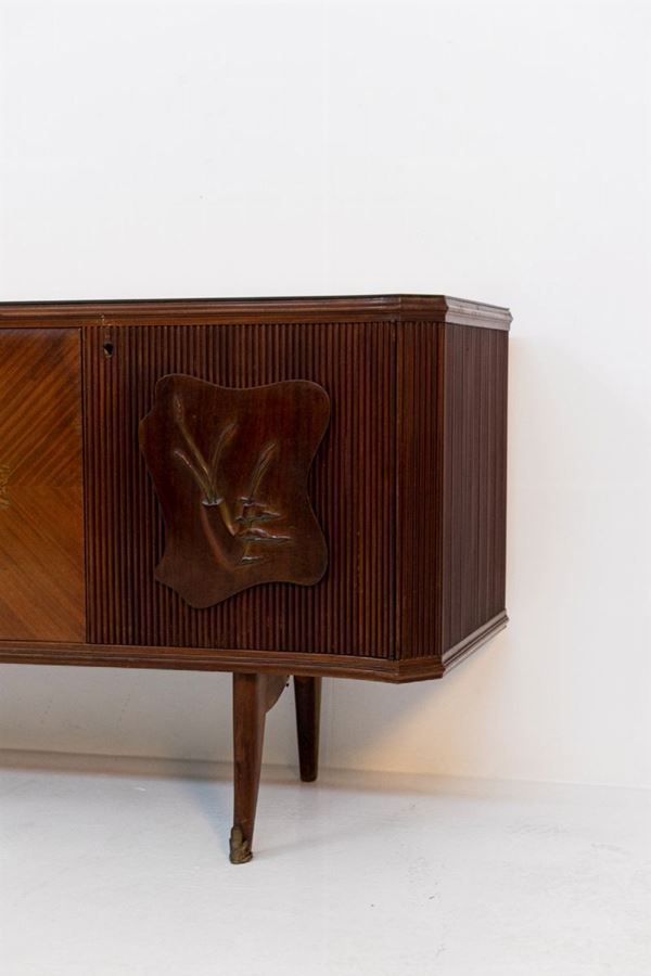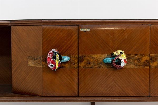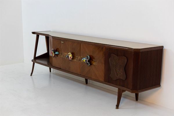 Rara e particolare madia in legno grissinato e intarsiato con manici in ceramica raffiguranti i segni dello zodiaco e piano in vetro opalino. Anni '50. Condizioni originali.