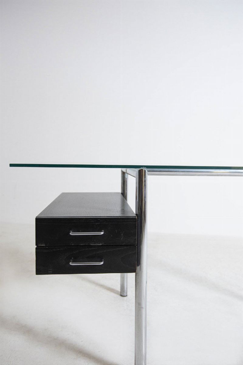 Scrivania in tubolare d'acciaio cromato, vetro e due cassetti in legno con maniglie in acciaio. Manifattura italiana. Anni '70. Perfette condizioni.