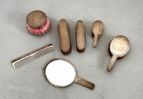 Set da toilette in argento composto da quattro spazzole, un pettine, uno specchio e un portacipria. Anni '30.