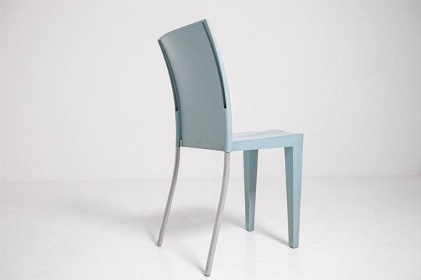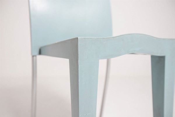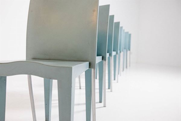 Otto sedie in propilene di colore azzurro e metallo. Produzione KARTELL. Anni '80. Difetti.