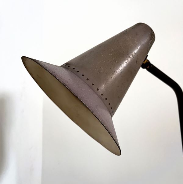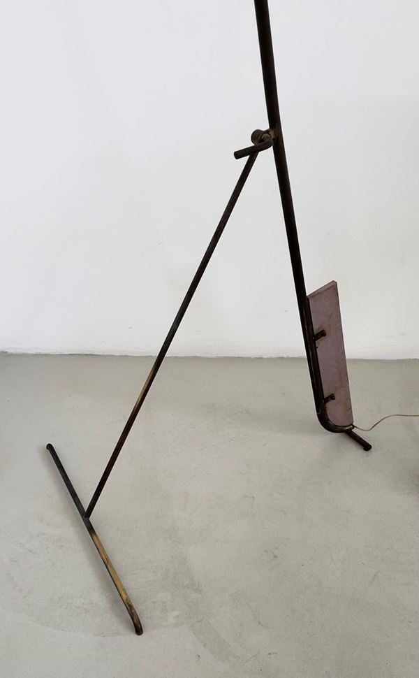 Rara lampada da terra in metallo, ottone verniciato e alluminio. Produzione STILNOVO. Anni '50.