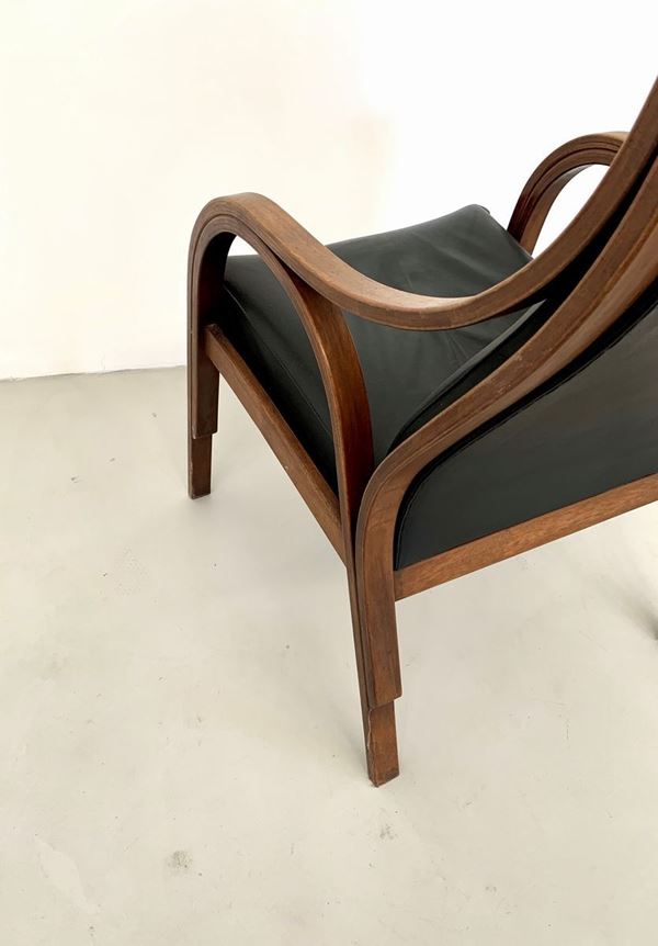 Sedia Cavour in legno e pelle nera. Produzione S.I.M. La sedia è stata pubblicata su: Il design in Italia dell'arredo casa edito da Allemandi e scritto da Giuliana Gramigna, Paola Biondi.