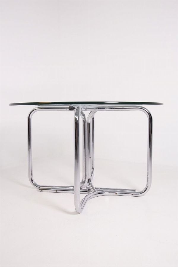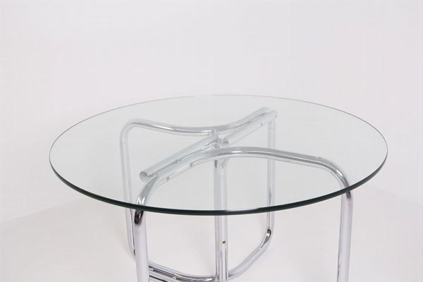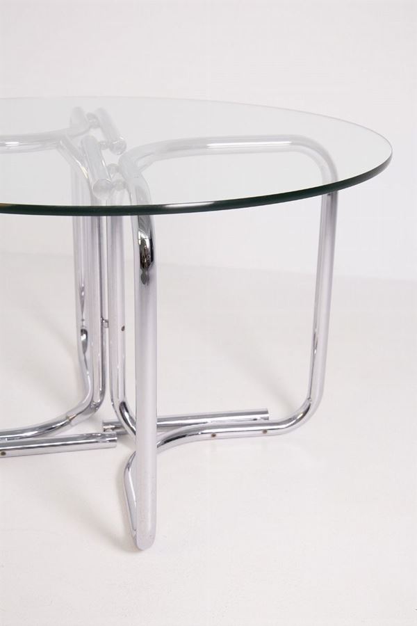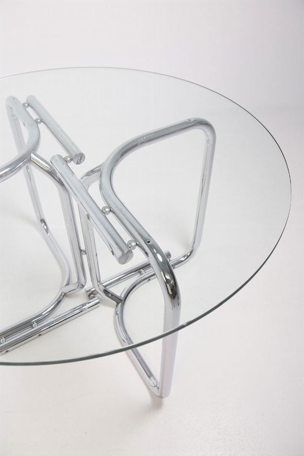 Tavolo rotondo con piano in vetro e base in acciaio. Anni '70.