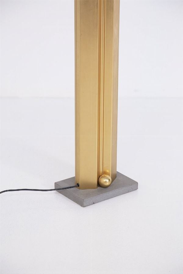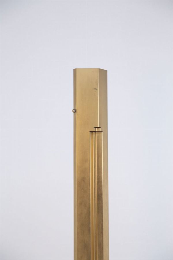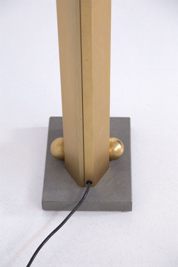 Lampada Totem in metallo dorato, pietra serena e ottone. Produzione SIRRAH. 1980.