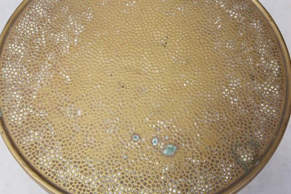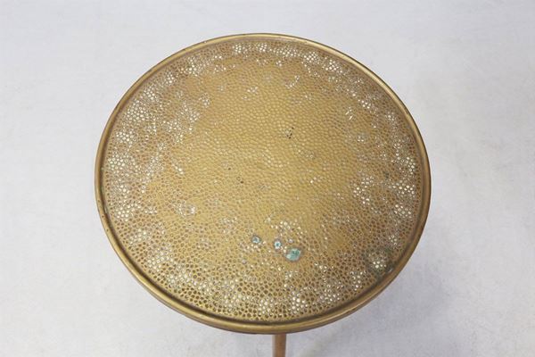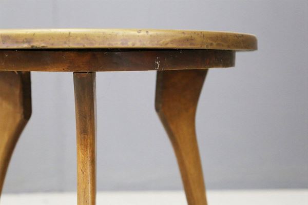 Tavolino a tre piedi in legno con piano rotondo in rame. Manifattura italiana. Anni '50. Condizioni originali.